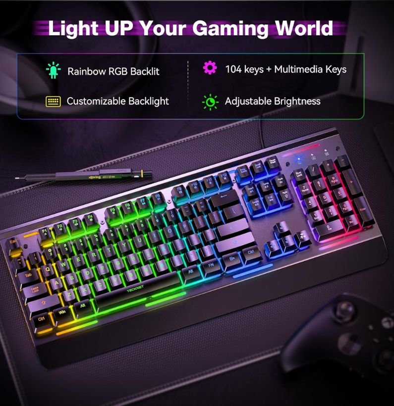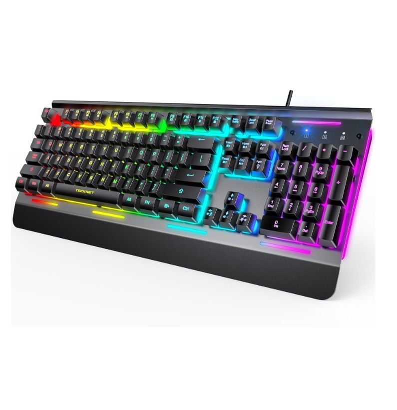 TECKNET Gaming Keyboard, USB Wired Computer Keyboard, 15-Zone RGB Illumination, IP32 Water Resistance, 25 Anti-ghosting Keys, All-Metal Panel (Whisper Quiet Gaming Switch)