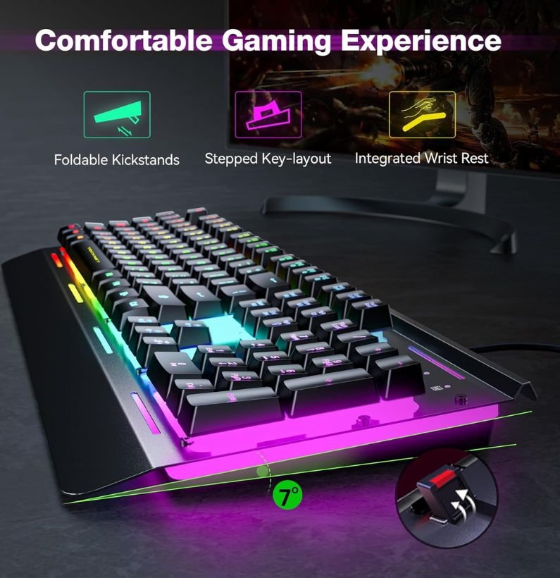 - 【Ergonomic Design, Enhanced Typing Experience】Improve your typing experience with our computer keyboard featuring an ergonomic 7-degree input angle and a scientifically designed stepped key layout. The integrated wrist rests maintain a natural hand position, reducing hand fatigue. Constructed with durable ABS plastic keycaps and a robust metal base, this keyboard offers superior tactile feedback and long-lasting durability.